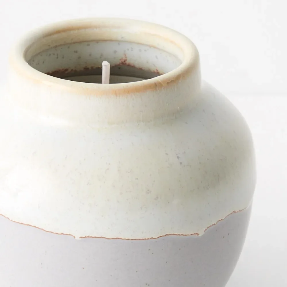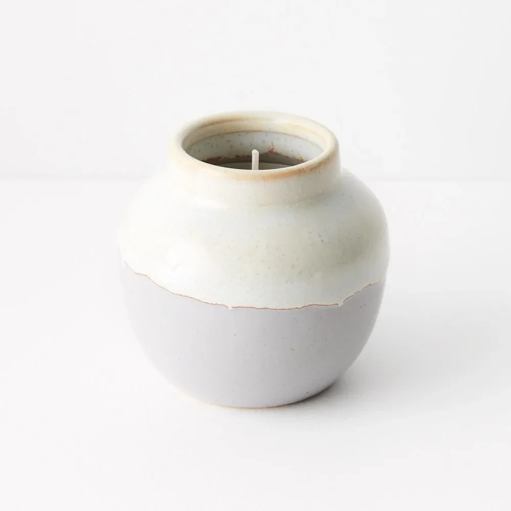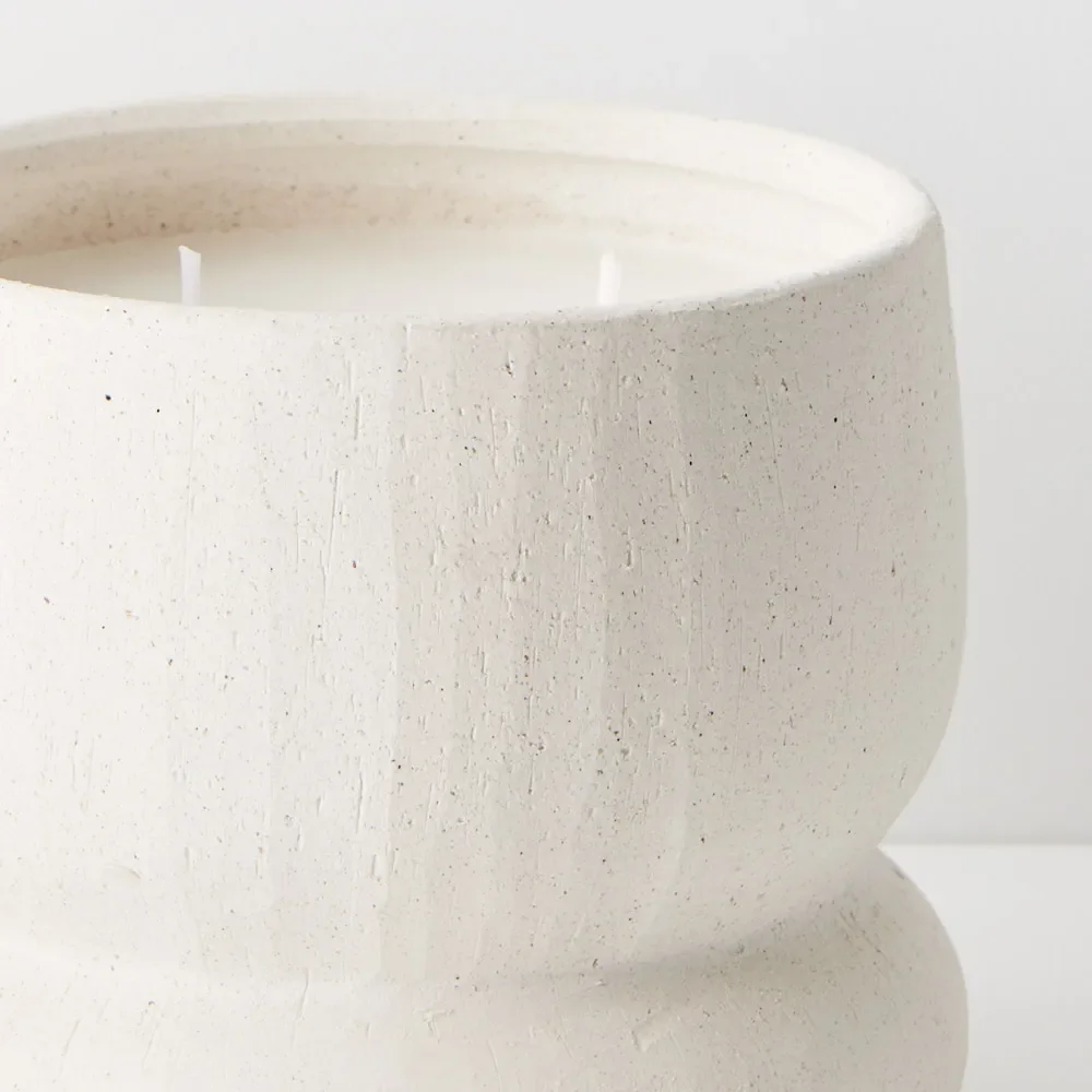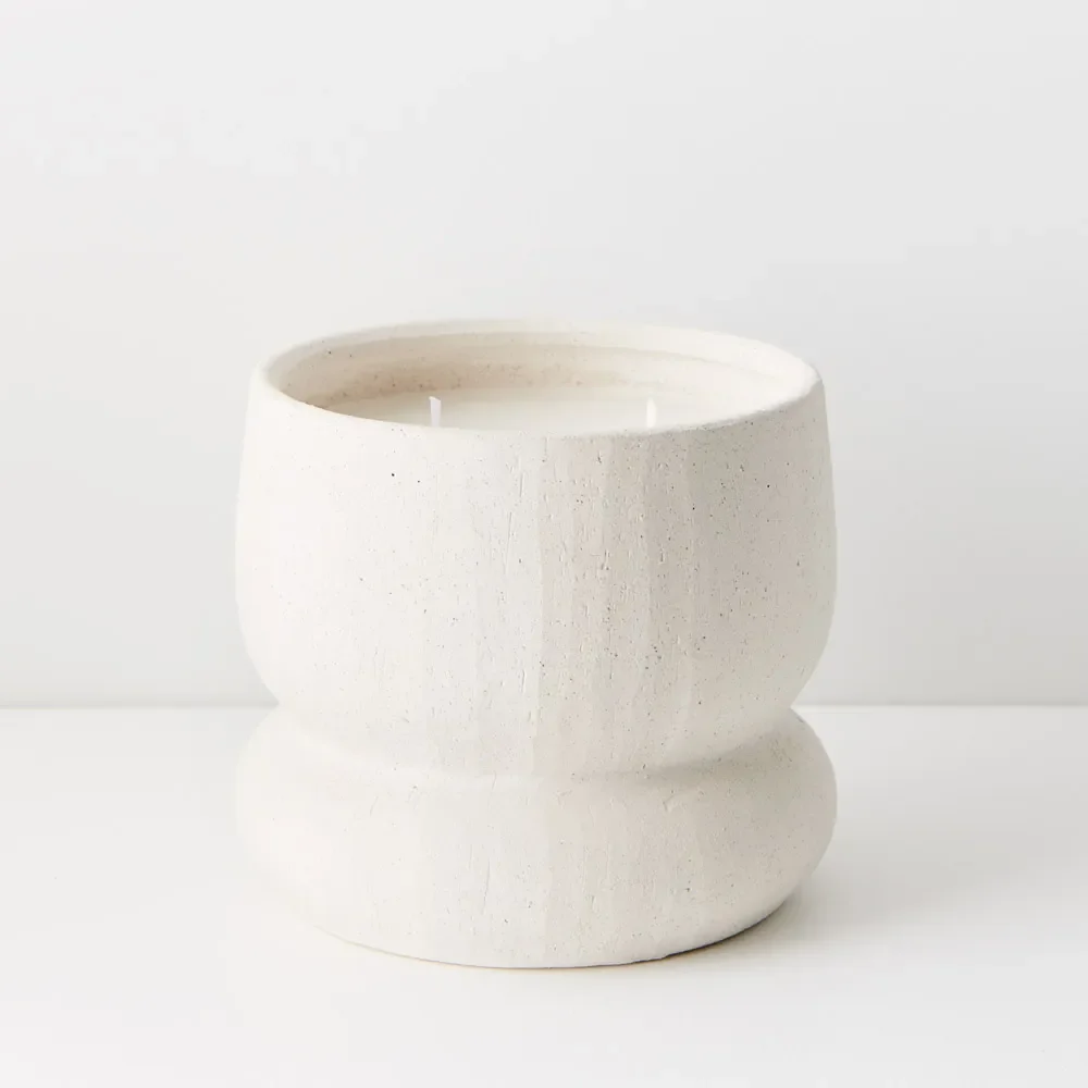 This white ceramic pot with a chalk finish houses a hand-poured candle. Its minimalist design makes it a versatile styling accent, adding a touch of understated elegance to any space. This small candle adds personality to the interiors of your home, being just as much about the pattern of the pot as it is about the mood created by the candle and her burgeoning scent.